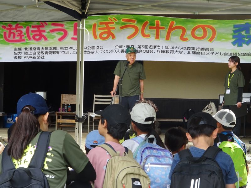 兵庫教育大学生による実行委員会が企画・運営を行い、「わんぱくだけじゃダメですか?~自然の中で新しい仲間と大冒険!!~」をテーマに、自然豊かな公園を広々と使った野外イベントを実施しました。フラッグハント、シャボン玉、ザリガニ駆除、水運びリレー、4択クイズなど、趣向を凝らした体験ブースを巡りました。また、こころ豊かな人づくり500人委員北播磨OB会によるバルーンアートや、陸上自衛隊青野原駐屯地による防災学習(土のう積み、応急担架搬送体験)やカレーライスもご協力いただきました。