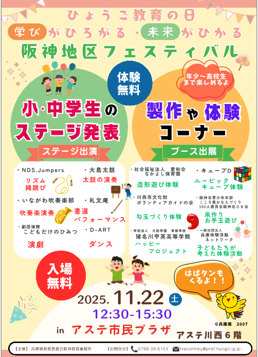 阪神地区の子どもたちが各学校園や地域での教育活動を発表し、自然・環境・文化に触れる体験を通じて兵庫の教育活動への理解を深めるため、令和7年度「ひょうご教育の日」~阪神地区フェスティバル~を開催します。当日は小・中学生のステージでの発表や、モノ作りの体験コーナーなど盛りだくさん。ぜひお越しください!