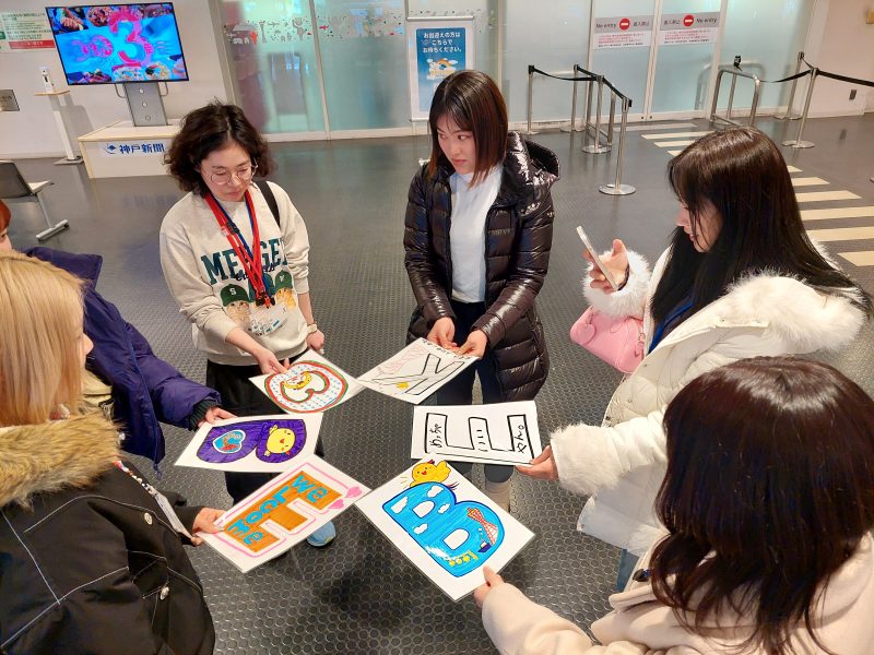 事前研修会で作成した「BE KOBE」のメッセージボードを手にチーム沖縄の到着を待ちます。
