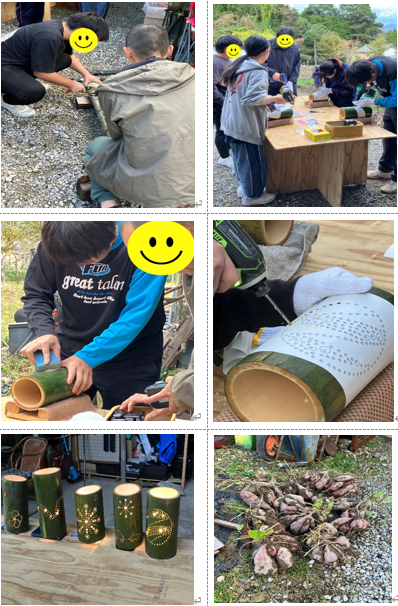 午前中は、地元の農作物の収穫や竹林の整備・伐採を体験。午後からは、伐採した竹を活用した「竹あかり」づくりに挑戦。力と根気のいる作業ですが、参加者は夢中になって取り組み、初めてとは思えないほどの作品が完成しました。出来上がった竹あかりには、それぞれの個性が光っていました。